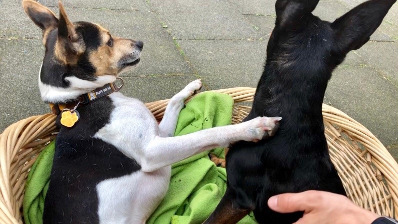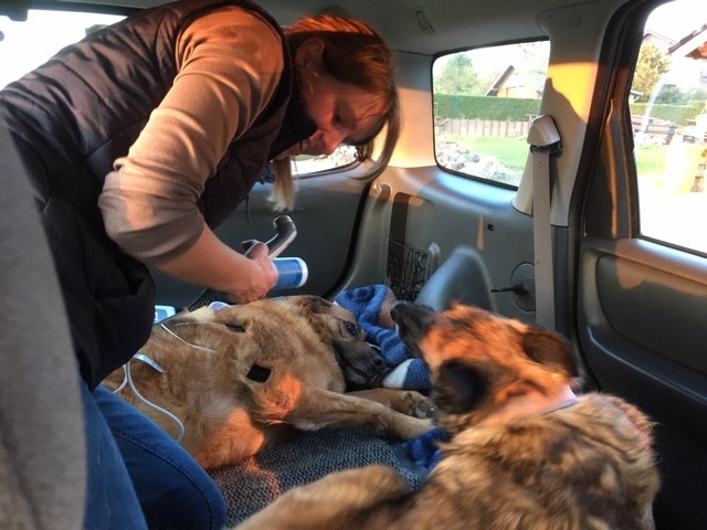 Ihre „belgische Verwandtschaft“ in Deutschland lässt es sich auch gut gehen. Jana und ihr Kumpel Linus gehen regelmäßig zur Physiotherapie. Und manchmal wird sogar improvisiert und im Auto behandelt (weil Linus nicht rausspringen durfte und Herrchen keine Zeit zum Raus- und Reinheben hatte…)